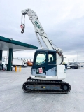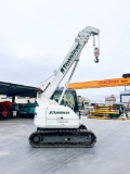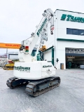 La minigrúa MC60 está capacitada para desplazarse con carga suspendida hasta 2 t. Equipamiento: Orugas de goma ó de acero. ࢚ Capacidad para cargas de 4.900 kg ࢚ Motor diesel ࢚ 15,63 m de longitud de pluma ࢚ 104 m de longitud de cabestrante (por debajo del nivel de apoyo) ࢚ Velocidad de elevación (4 reenvíos): 27,0 m/min (baja), 39,0 m/min (alta) ࢚ Presión sobre el terreno: 46,8 kPa (0,48 kg/cm²) ࢚ Largo x ancho de cadenas: 2.235 mm x 450 mm ࢚ Peso: 9.700 kg